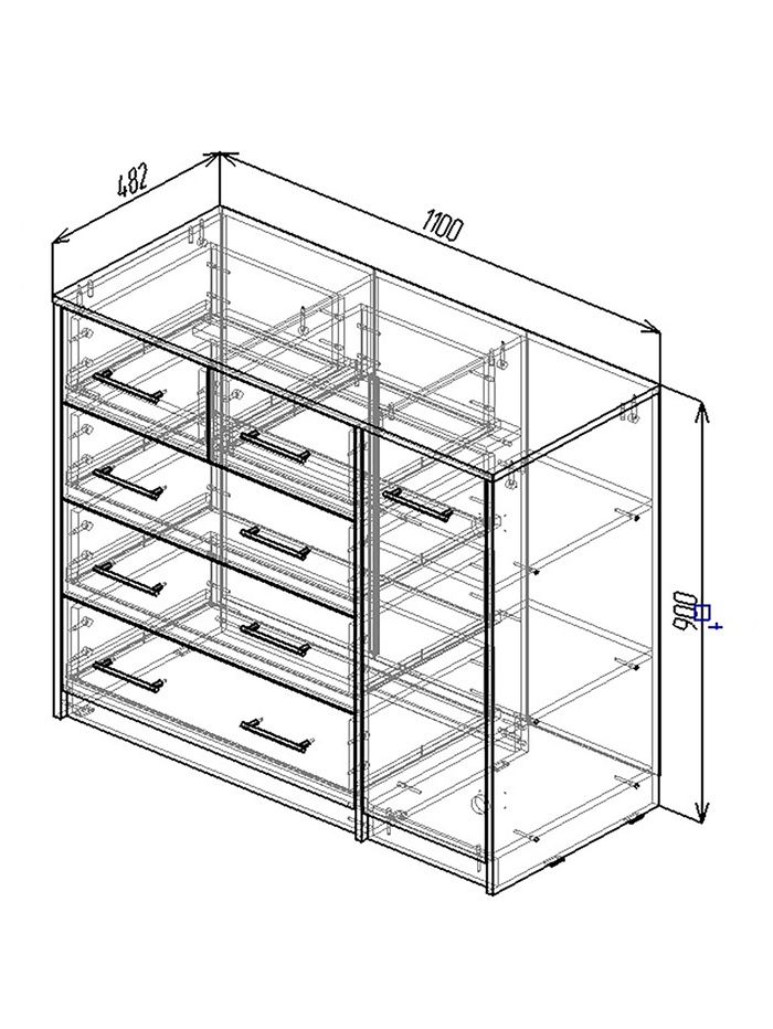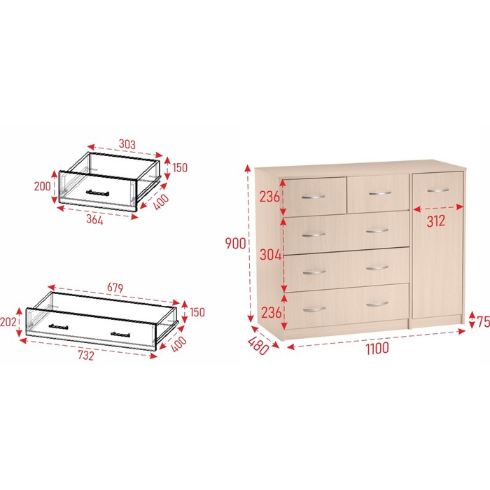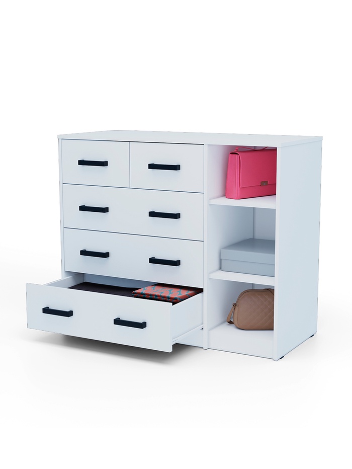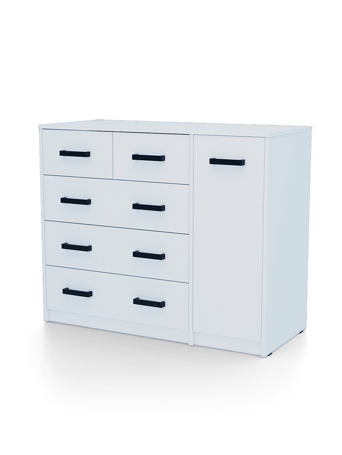 Комод 5 ящиков с дверью, 1100х480х900 - большой и вместительный. Удобный вариант мебели для хранения белья, постельных принадлежностей и личных вещей. Данная модель выглядит компактно и визуально не загромождает пространство. Она позволит вместить большое количество вещей. Ящики изделия выдвигаются полностью и плавно, не упираясь в стенки. Тумба универсального цвета без труда подойдёт под спальный гарнитур и оформление комнаты.