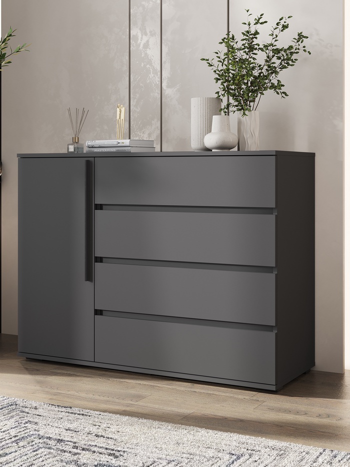 - Вместительность: 4 удобных ящика и 1 дверца для хранения различных вещей