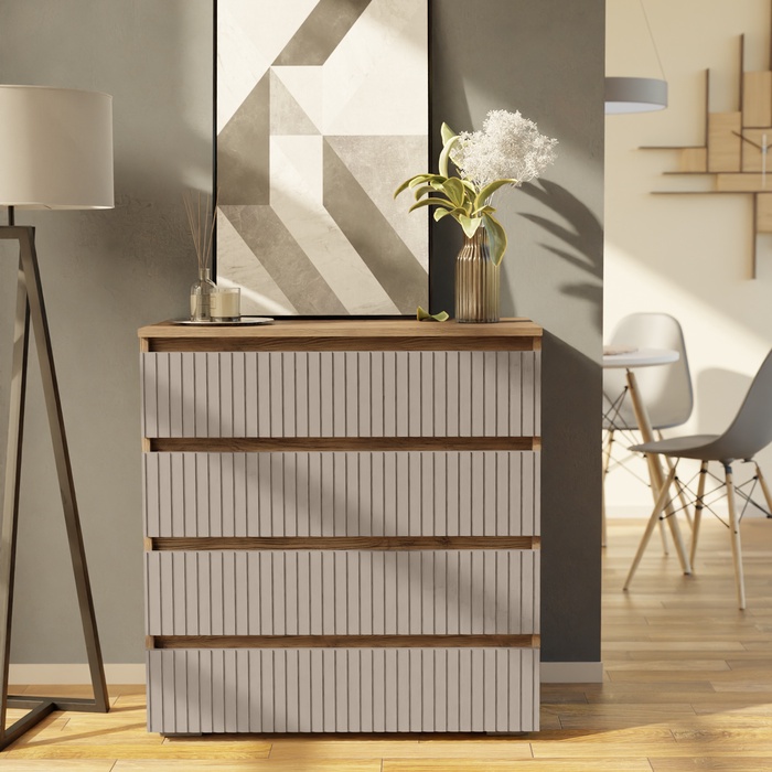 - Элегантный дизайн: фасад из МДФ с вертикальной фрезеровкой придает комоду современный и изысканный вид, который гармонично впишется в любой интерьер, от классики до модерна.