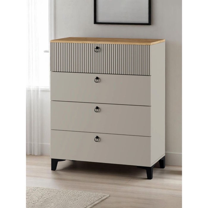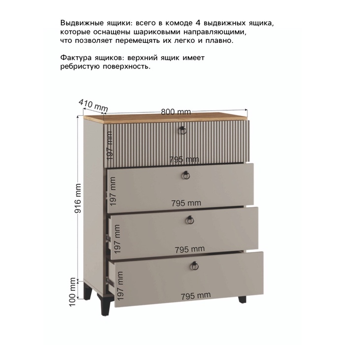 - Выдвижные ящики: Всего в комоде 4 выдвижных ящика, которые оснащены шариковыми направляющими, что позволяет перемещять их легко и плавно.