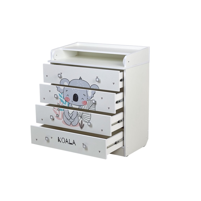 Вместительные выдвижные ящики комода шириной 80 см с системой плавного закрытия позволят удобно хранить все детские принадлежности. Когда малыш вырастает из возраста пеленания, поверхность может быть снята, тогда комод приобретет классический вид.