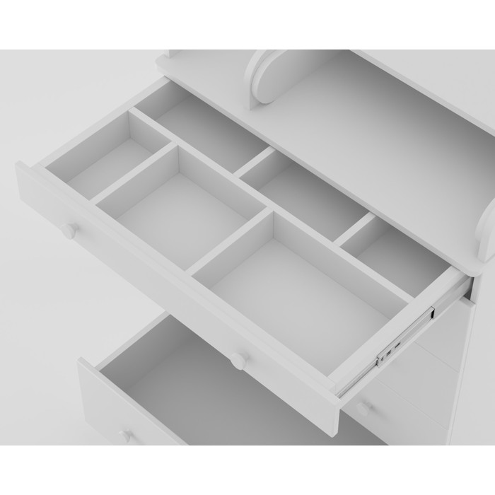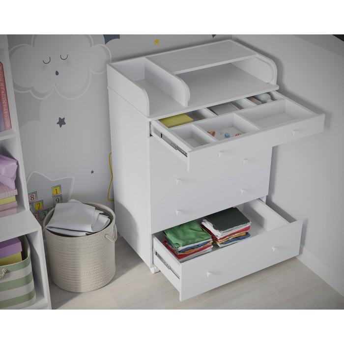 Удобный и практичный комод с пеленальным столиком незаменимый предмет для детской комнаты . Пеленальный столик с откидной крышкой не только помогает маме в переодевание ребенка, но при этом экономит пространство в помещении за счет удобного механизма складывания .Верхний ящик оснащен органайзером .Четыре вместительных ящика с легкостью выдвигаются на шарикоподшипниковых направляющих .Комод имеет закругленные углы ,что полностью безопасно для малыша .В дальнейшем пеленальный столик можно демонтировать и продолжить использовать комод в классическом стиле .В комплект комода входят прорезиненные колеса при помощи которых удобно передвигать комод во время влажной уборке .