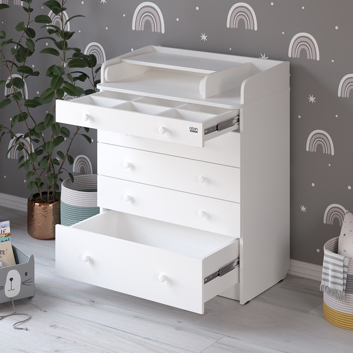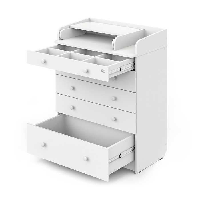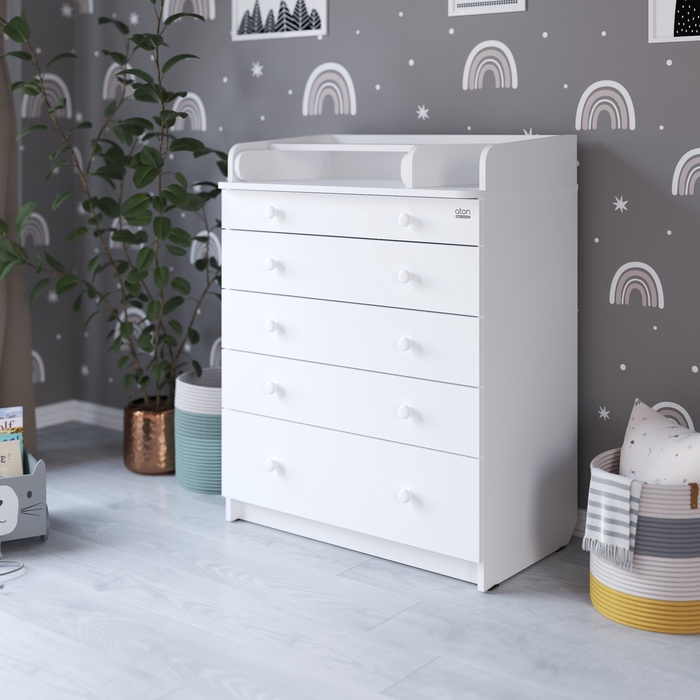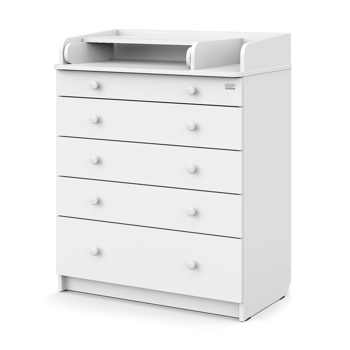 Удобный, практичный и очень функциональный комод Атон LEO с узким, откидным пеленальным столиком для новорожденных, 5 ящиками и органайзером для мелочей идеально впишется в любой интерьер детской комнаты, благодаря большому выбору цветовых сочетаний и стильному дизайну. Корпус изготовлен из качественного ЛДСП. Фасады ЛДСП.