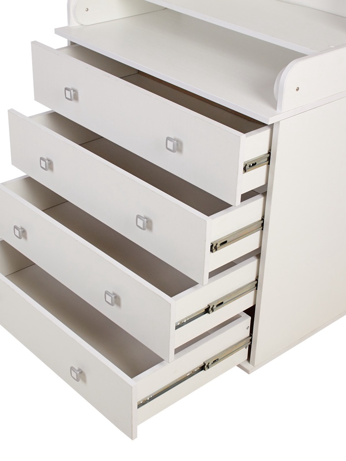 Комод имеет 4 вместительных ящика на шариковых направляющих, в которых удобно хранить детские вещи, аксессуары и игрушки.