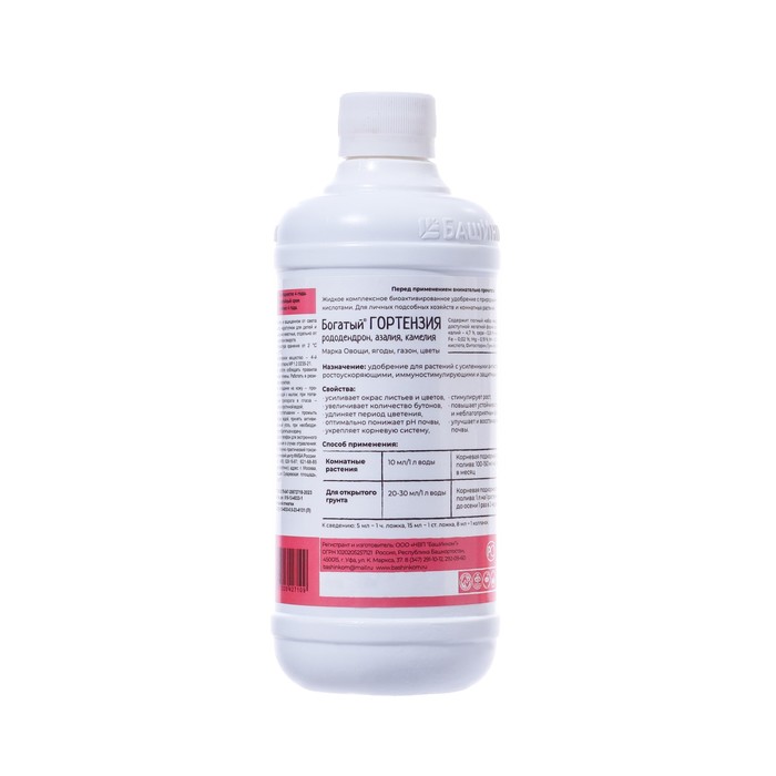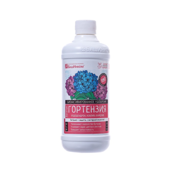 Препарат «Богатый Гортензия» для гортензий, рододендронов, азалий. Это современное инновационное биоудобрение  увеличивает количество бутонов, усиливает окрас цветов и листьев, повышает зимостойкость.Это полноценное питание и защита, с янтарной кислотой.Удобрение обладает большим спектром действия:-оптимально понижает Ph почвы-укрепляет корневую систему-стимулирует рост-увеличивает количество бутонов-удлиняет период цветения-усиливает окрас листьев и цветов-повышает устойчивость к болезням и неблагоприятным факторам среды-увеличивает и восстанавливает плодородие почвы