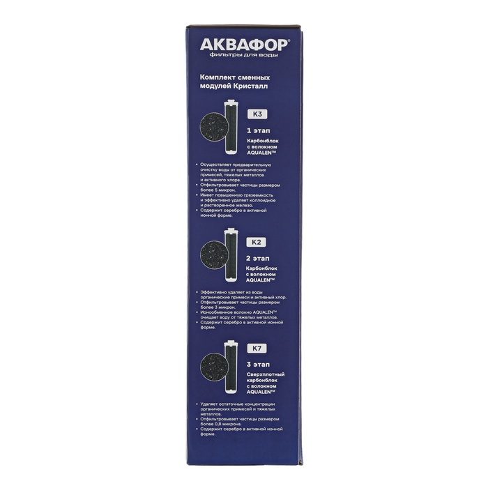 Комплект модулей для "Аквафор" Кристалл – подойдет мягкой воды. Используется как полный комплект сменных модулей в фильтре Аквафор Кристалл (для мягкой воды) или как набор предфильтров в системе Аквафор КОСМО.