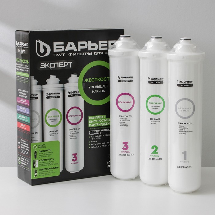 Комплект сменных модулей «Барьер. Эксперт Жёсткость» для жёсткой воды обеспечивает глубокую очистку воды от хлора, органических соединений и других примесей, избавляет от солей жёсткости. Данный комплект сменных модулей снижает жёсткость воды, подходит для регионов с повышенным содержанием в воде солей жёсткости.