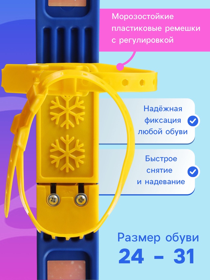 Пластиковые ремешки надёжно фиксируют ногу. Лыжи подходят для крепления к повседневной обуви: 24–31 размеры.