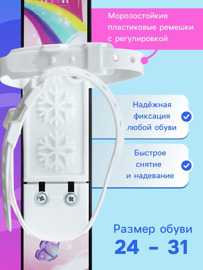 Пластиковые ремешки надёжно фиксируют ногу. Лыжи подходят для крепления к повседневной обуви: 24–31 размеры.