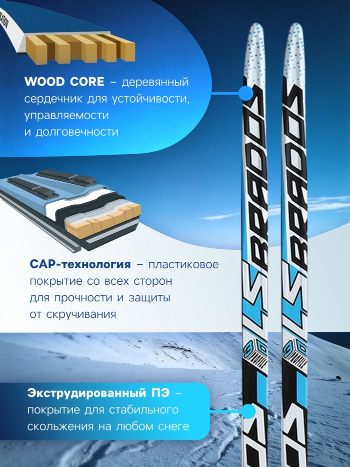 В лыжах применяется зарекомендовавшая себя технология ABS Cap. Это покрытие, которое делает лыжи очень прочными и устойчивыми к торсионному воздействию (скручивание). Скользящая поверхность лыж выполнена из экструдированного пластика, имеющего хорошие характеристики по качеству скольжения.