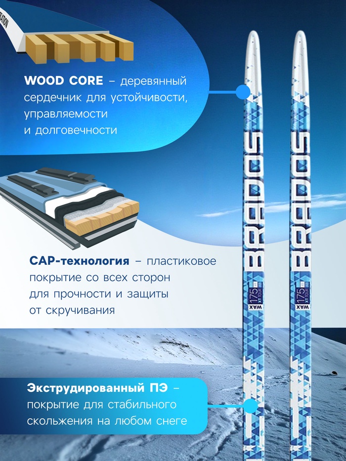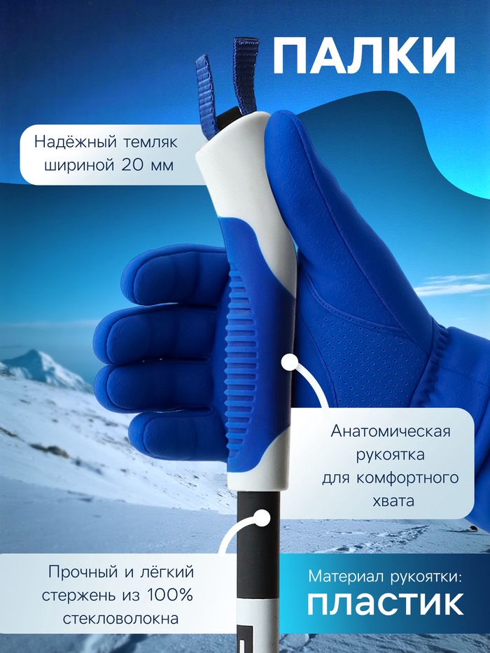 Материал лыжных палок — стеклопластик — гарантирует спортсмену надёжность и прочность всей конструкции, увеличивает срок эксплуатации. Большим плюсом в данной модели является простота подготовки. Предварительная обработка не требуется, достаточно встать и поехать.