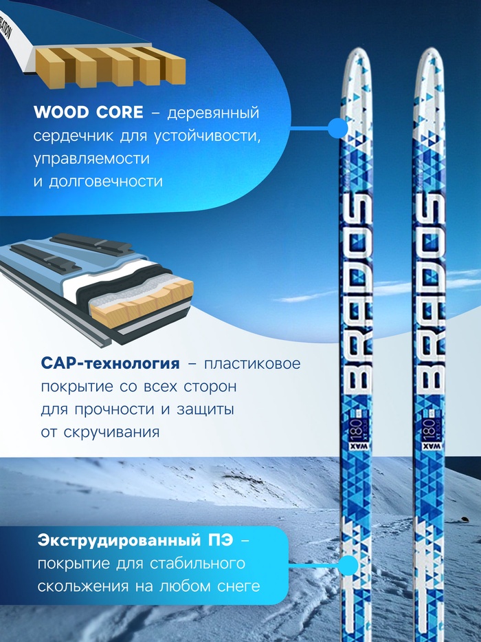 состав: технология САР. Клин деревянный. Скользящая поверхность: экструдированный ПЭ, геометрия 44. Палки из стеклопластика;