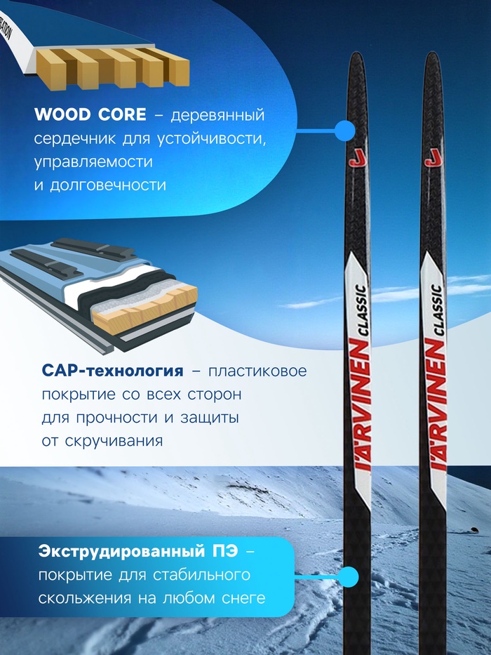 Материал лыжных палок — стеклопластик — гарантирует спортсмену надёжность и прочность всей конструкции, увеличивая срок эксплуатации. Большим плюсом в данной модели является простота подготовки, предварительная обработка не требуется, достаточно встать и поехать.