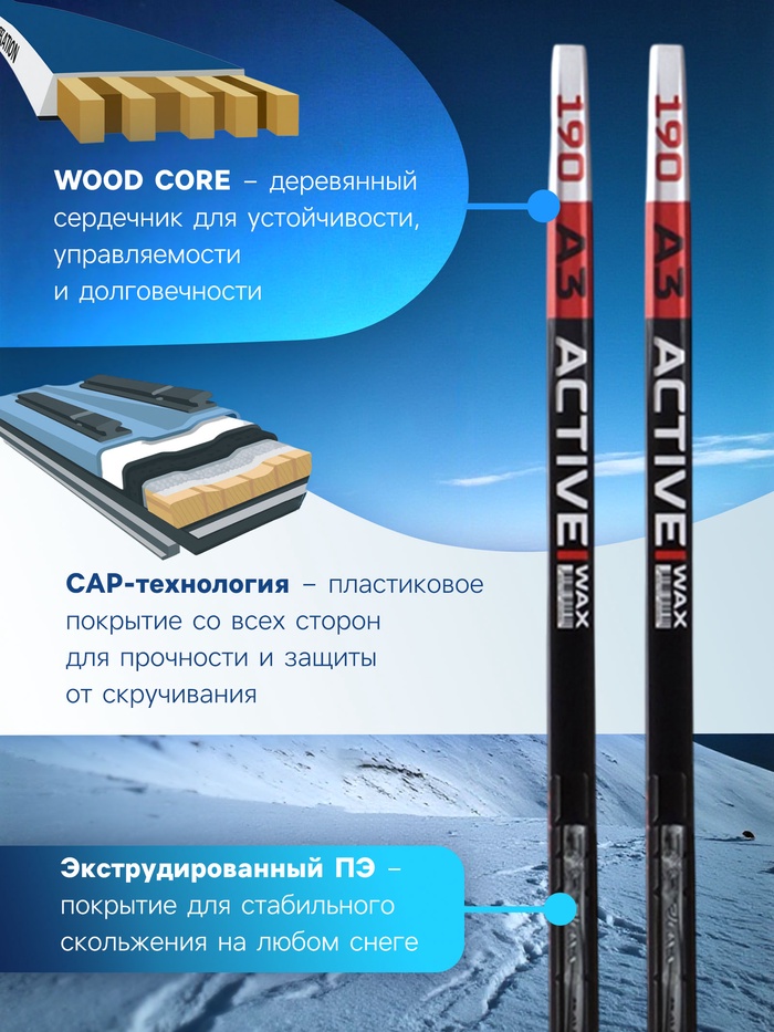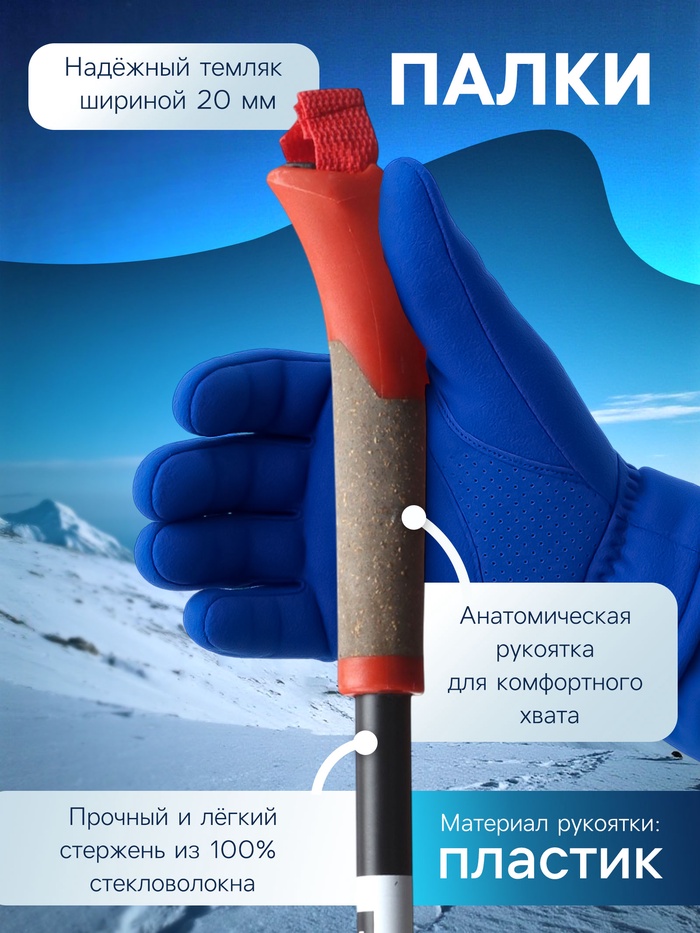 Материал лыжных палок — стеклопластик — гарантирует спортсмену надёжность и прочность всей конструкции, увеличивая срок эксплуатации. Большим плюсом в данной модели является простота подготовки, предварительная обработка не требуется, достаточно встать и поехать.