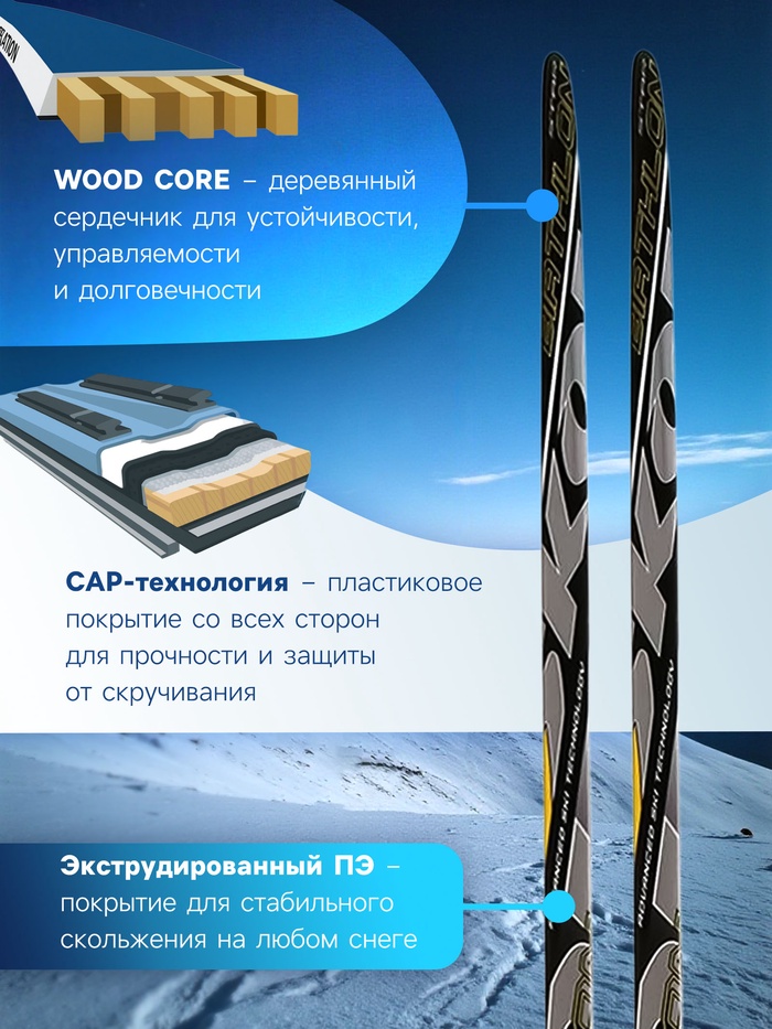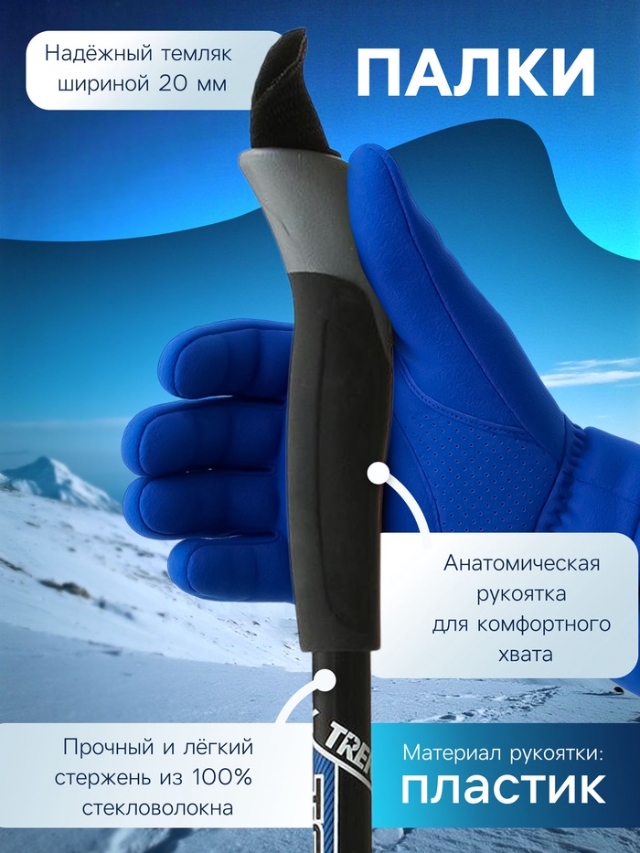 Материал лыжных палок — стеклопластик — гарантирует спортсмену надёжность и прочность всей конструкции, увеличивая срок эксплуатации. Большим плюсом в данной модели является простота подготовки, предварительная обработка не требуется, достаточно встать и поехать.
