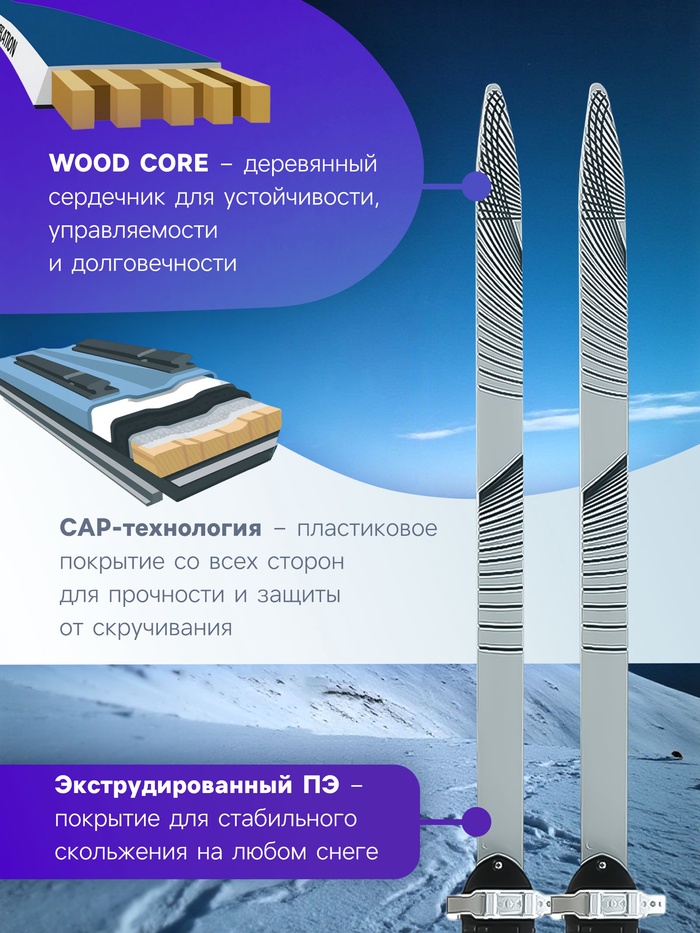 Технология газонаполненного литья гарантирует высокую прочность и оптимальную жёсткость полоза для начинающих лыжников. Противооткатная насечка на полозе не даёт лыжам проскальзывать на снегу.