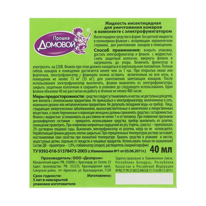 Форма выпуска: полимерный флакон с испаряющим стержнем и защитным колпачком в комплекте с электрофумигатором, в картонной коробке.