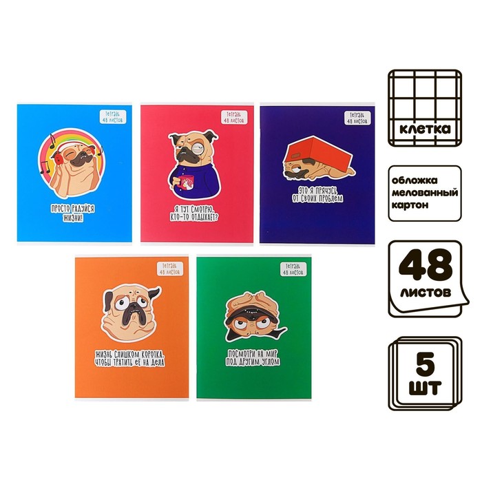 Комплект тетрадей из 5 штук, 48 листов в клетку Calligrata "Мопс", обложка мелованный картон, блок офсет