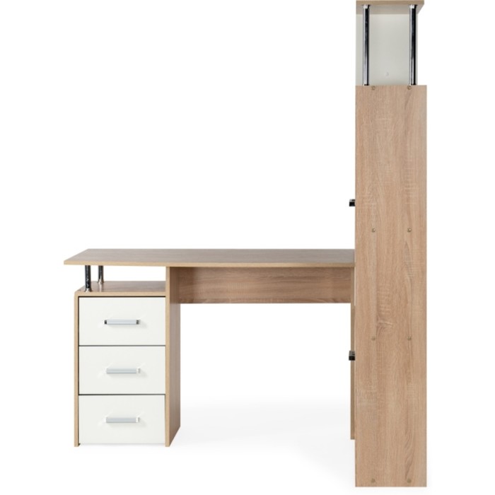 Компьютерный стол КС-15 - все самое необходимое для комфортного рабочего места. Комплектация представлена из: письменного стола с тумбой с выдвижными ящиками, двух шкафчиков, где можно хранить все самое необходимое под рукой, и надстройки с полками для книг и предметов декора. Каркас и фасад выполнен из ЛДСП. На столешнице без труда можно разместить компьютер и предметы для учебы. Полки уже встроены в конструкцию надстройки, что позволяет не сверлить стены.