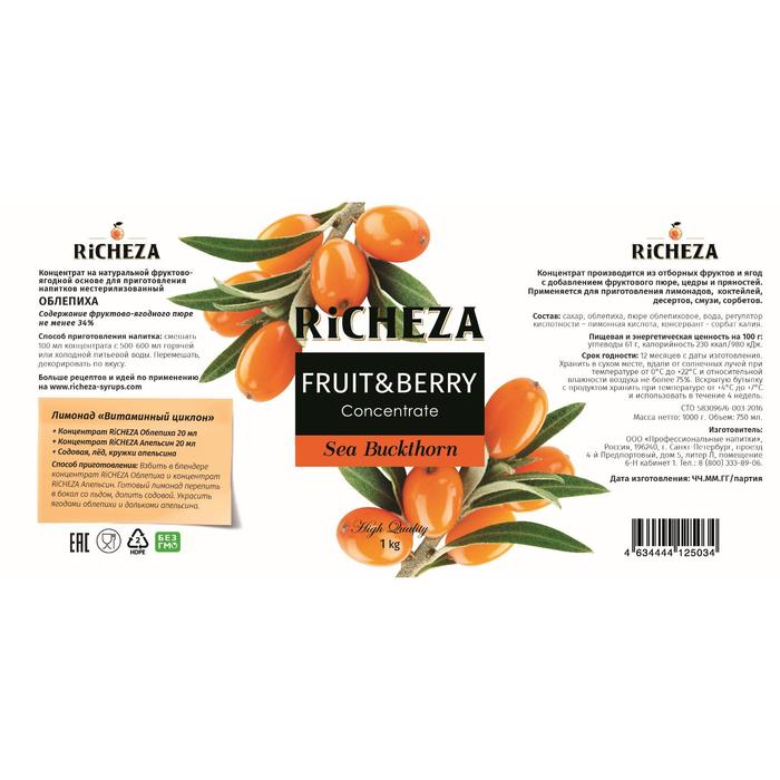 Концентрат RiCHEZA «Облепиха» – кладезь витаминов, присущих натуральной ягоде. Облепиха славится приятным кисло-сладким вкусом, а также своеобразным, неповторимым ароматом, который отдалённо напоминает ананас. Ароматный и яркий концентрат наполнит неповторимым вкусом любой напиток! Содержание фруктово-ягодного пюре не менеё 34 %.