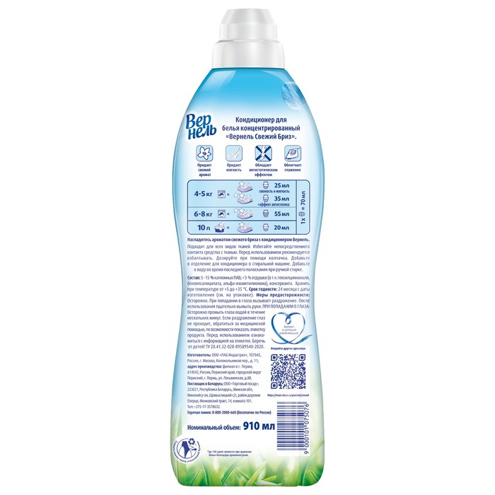Концентрированный кондиционер для белья Вернель Свежий Бриз подарит белью не только невероятную мягкость, но и легкий пробуждающий аромат.