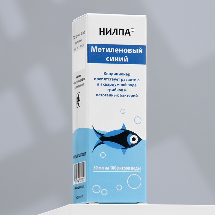 Способ применения: Непосредственно перед внесением кондиционера НИЛПА® «Метиленовый синий» в аквариум рекомендуется заменить 30% воды. В качестве подменной воды надо использовать отстоянную в течение не менее суток водопроводную воду.