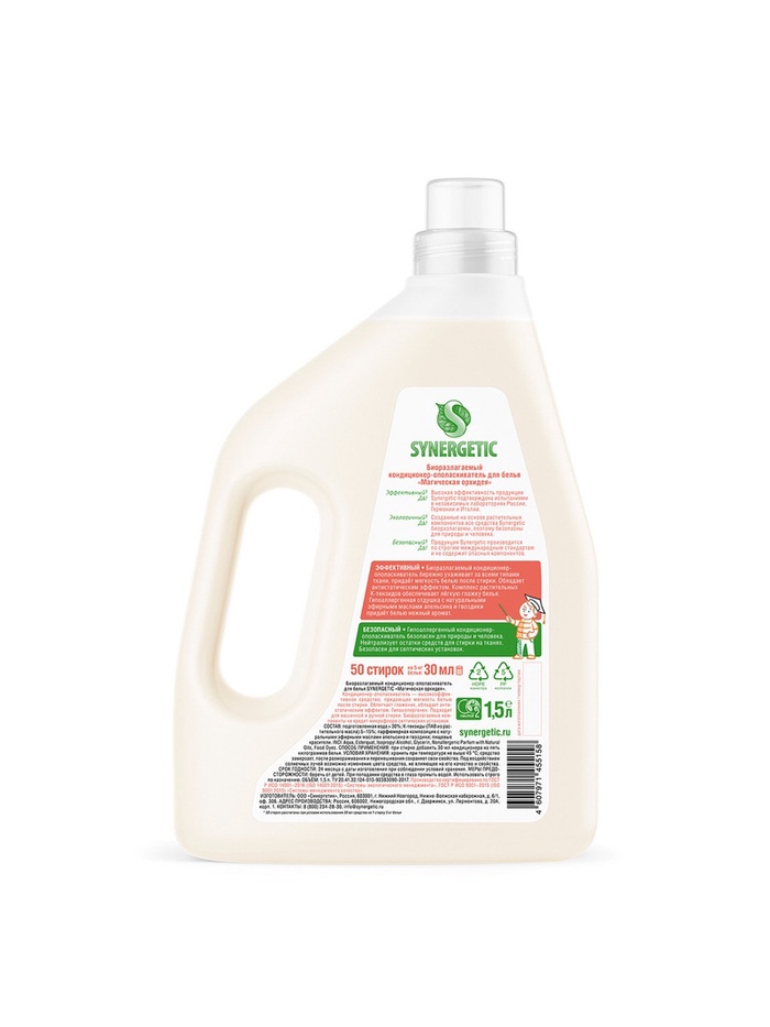 Биоразлагаемый кондиционер-ополаскиватель для белья SYNERGETIC "Магическая орхидея" – высокоэффективное средство, бережно ухаживающее за всеми типами ткани, в том числе деликатными, и придающее особую мягкость и нежность белью после стирки.