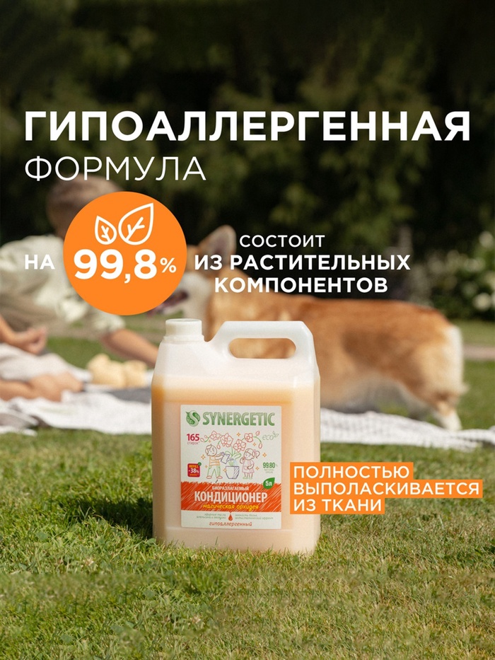 Биоразлагаемый кондиционер-ополаскиватель для белья SYNERGETIC "Магическая орхидея" – высокоэффективное средство, бережно ухаживающее за всеми типами ткани, в том числе деликатными, и придающее особую мягкость и нежность белью после стирки.