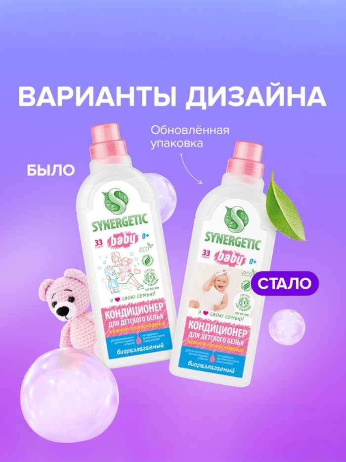 Биоразлагаемый кондиционер-ополаскиватель для детского белья SYNERGETIC "Нежное прикосновение" – высокоэффективное средство, бережно ухаживающее за всеми типами ткани, в том числе деликатными, и придающее особую мягкость и нежность белью после стирки.