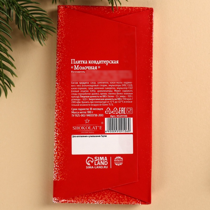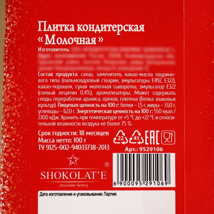 Состав: сахар, какао-масло, какао тёртое натуральное, сухое обезжиренное молоко, молочный жир, эмульгатор Е322 (соевый лецитин 0,4 %), ароматизатор "Ваниль".