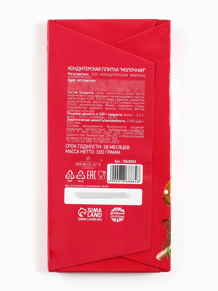 Состав: сахар, заменитель какао-масла лауринового типа (пальмоядровый стеарин, эмульгаторы Е492, Е322), какао-порошок, сухая молочная сыворотка, эмульгатор Е322 (соевый лецитин 0,4 %), ароматизаторы. Может содержать следы переработки арахиса, орехов, глютена (белка злаковых культур).