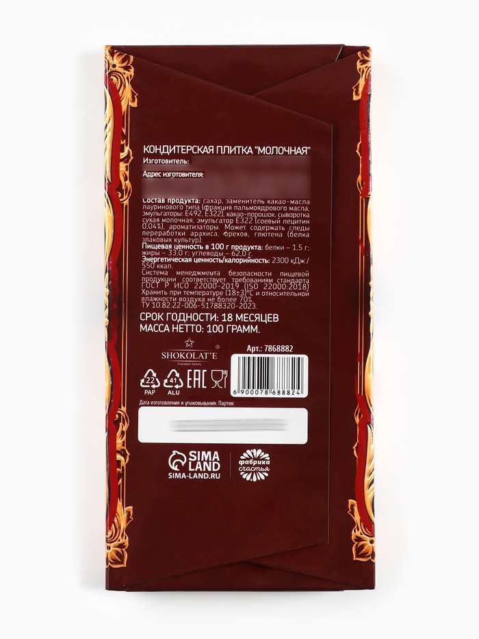 Состав: сахар, заменитель какао-масла лауринового типа (пальмоядровый стеарин, эмульгаторы Е492, Е322), какао-порошок, сухая молочная сыворотка, эмульгатор Е322 (соевый лецитин 0,4 %), ароматизаторы. Может содержать следы переработки арахиса, орехов, глютена (белка злаковых культур).