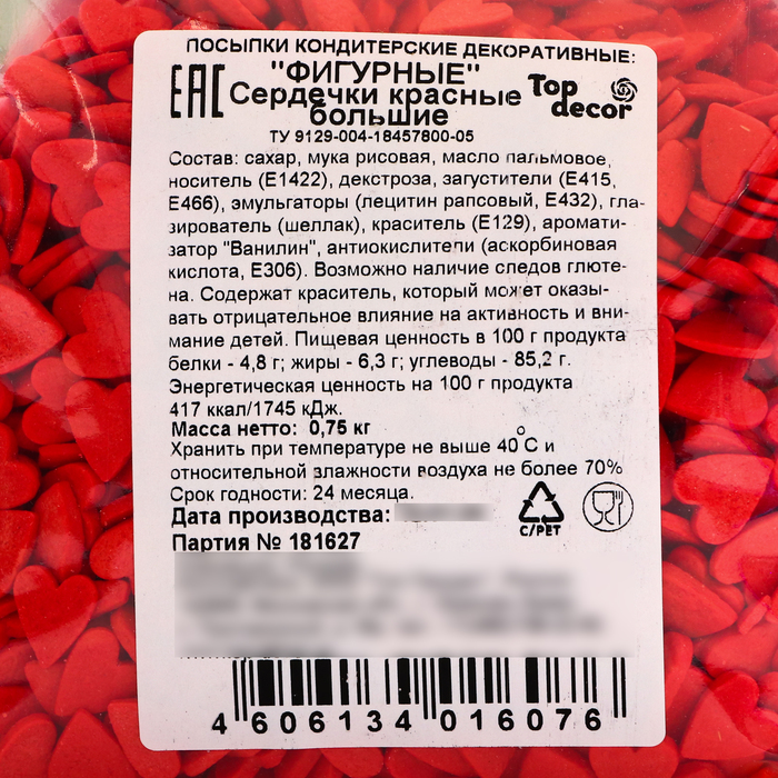 Фигурные посыпки — декор на основе сахара и рисовой муки, подчеркивающий принадлежность десерта к определенному празднику, событию или идее при минимуме трудозатрат на процесс декорирования. Это съедобный аналог эмодзи, с помощью которого можно передать послание без надписей и слов. Используются на сливочном, масляном, творожном, белковом креме, кондитерских глазурях, желейных и мармеладных массах, на шоколаде и мастике. Фигурные посыпки подходят для декора верхней и боковой поверхности десерта, их можно добавлять внутрь изделия (например, в леденцы). Специальная глазировка не дает цвету посыпок мигрировать на декорируемую поверхность. Декор посыпками легко внедрить на производстве любого размера.