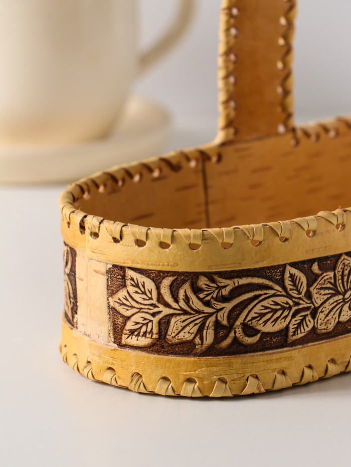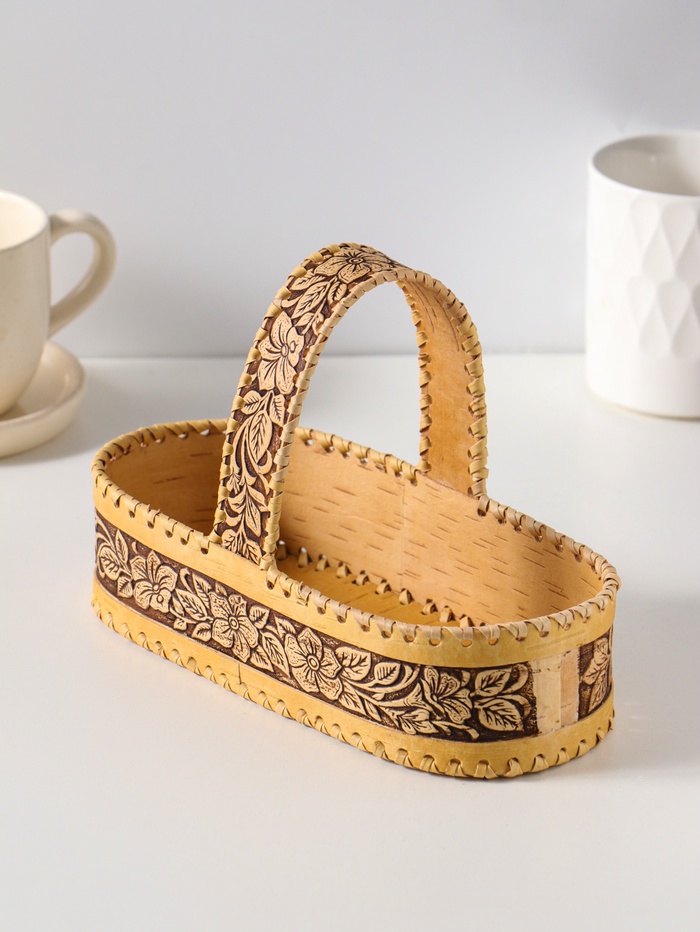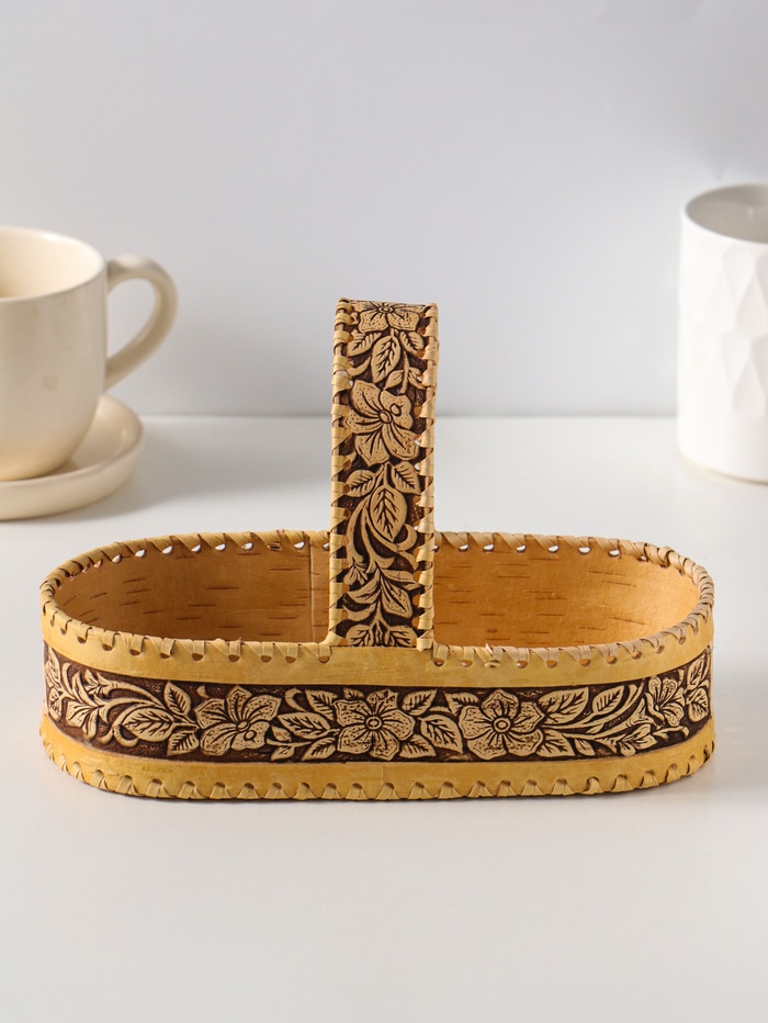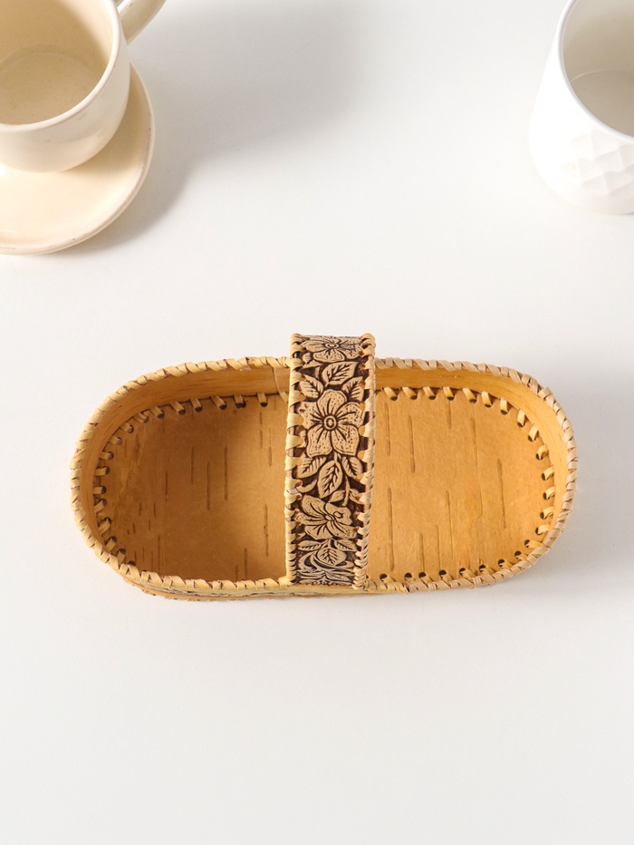 Эта овальная конфетница из бересты станет тёплым и душевным акцентом в вашем доме. Она создана для того, чтобы уютно хранить сладости, печенье или хлеб, превращая обычное чаепитие в маленький ритуал. Каждое изделие уникально — мастер вручную формирует рельефный узор с цветочными мотивами, наполняя его природной теплотой и энергией натурального материала.