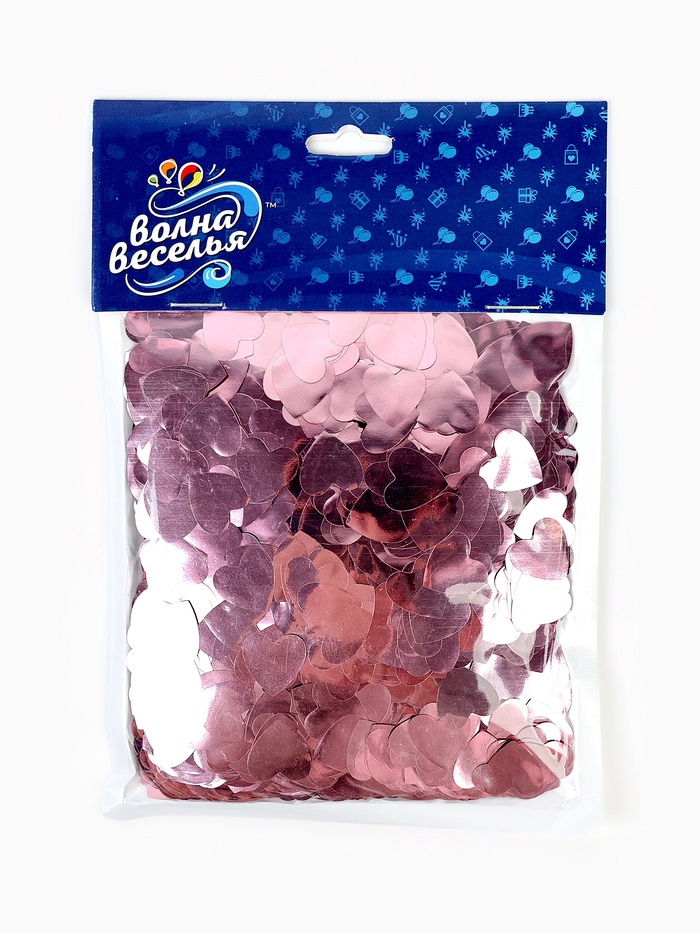 Светло-розовое металлическое конфетти в форме сердец — как ”рассыпанные отблески утреннего заката на розовом кварце“. Это не инфантильный румянец, а мягкий, уверенный оттенок с лёгким перламутрово-золотистым отливом — нежность с достоинством. Форма сердца остаётся узнаваемой, но не назойливой: каждый элемент — не символ, а *намёк*, трепетный, но не сентиментальный. Подходит для композиций, где важна тонкая эмоциональная окраска.
