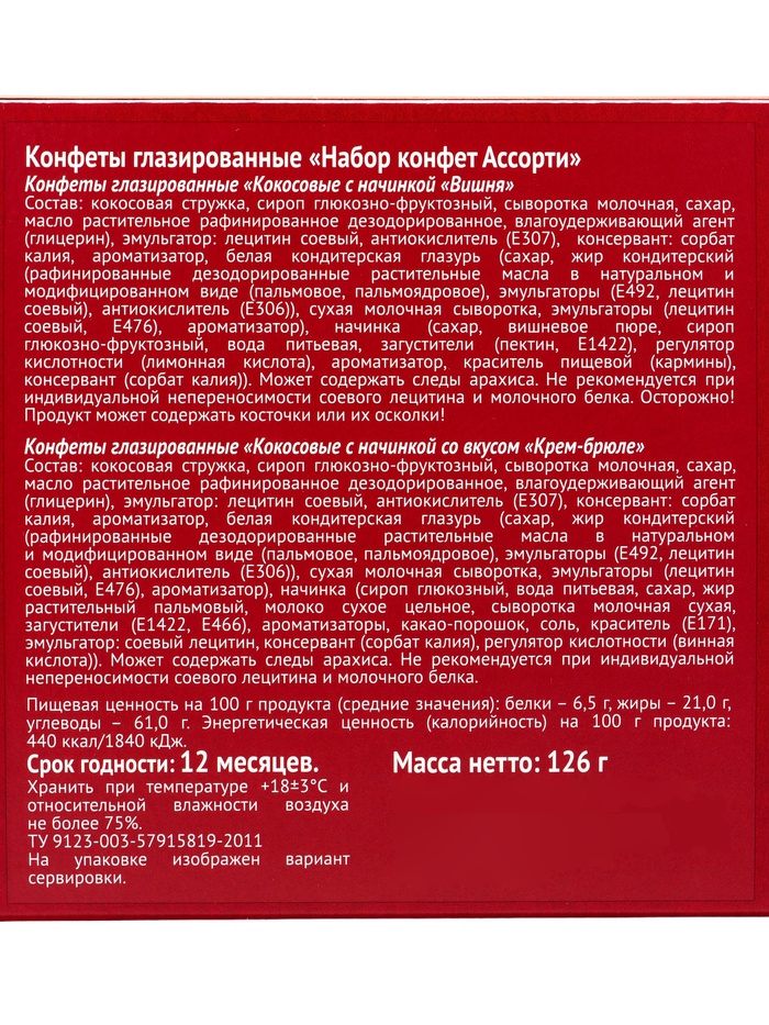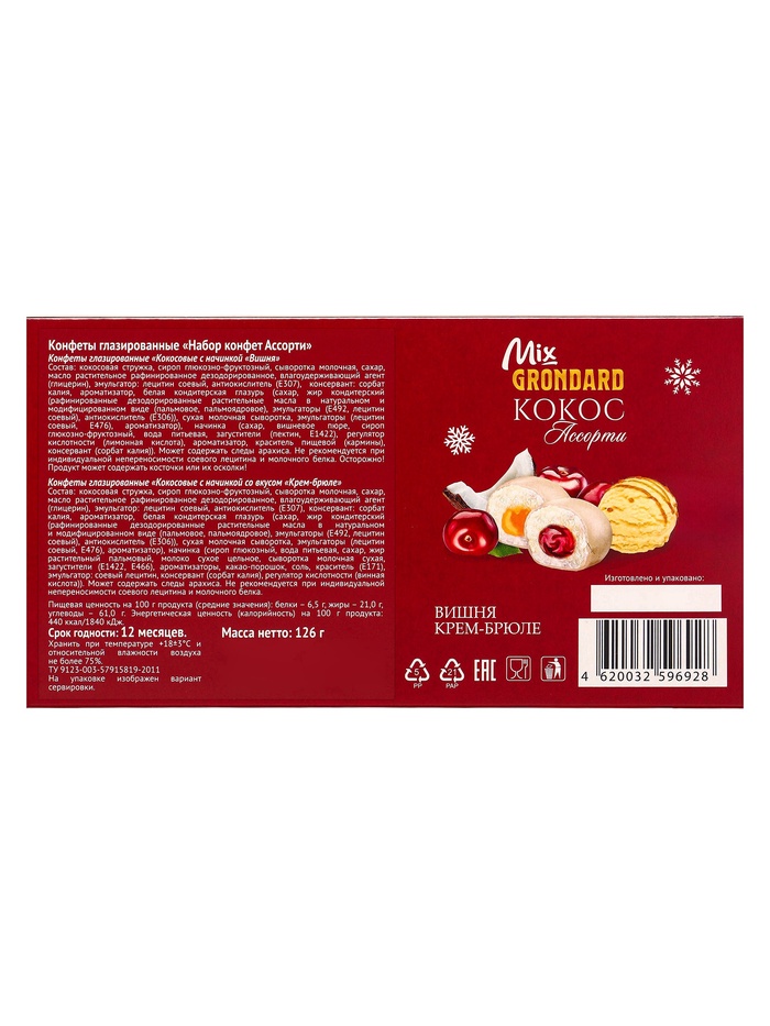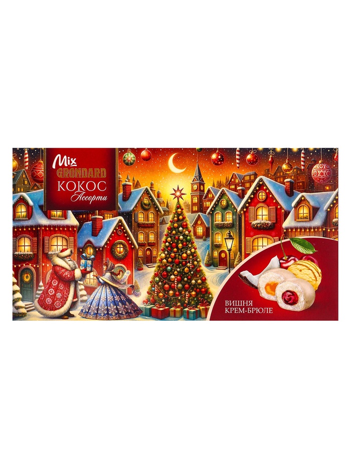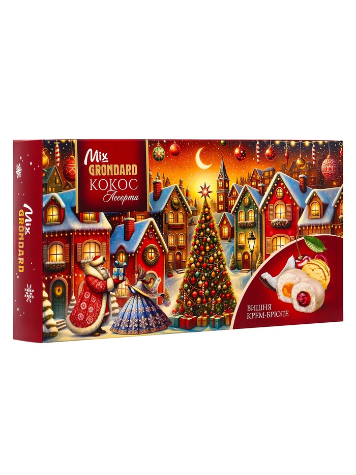 Создайте сладкое настроение для самого волшебного праздника! Новогодний ассортимент глазированных конфет — это коллекция из трех изысканных вкусов в праздничной упаковке. Насладитесь сочной вишней, нежным крем-брюле и тропическим кокосом в одном наборе.