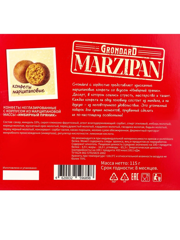 Почувствуйте аромат праздника в каждой конфете! Марципановые конфеты с вкусом имбирного пряника — это неглазированное лакомство, которое сочетает нежность миндальной массы и согревающие пряные ноты. Идеальный вариант для создания уютной атмосферы зимних праздников.