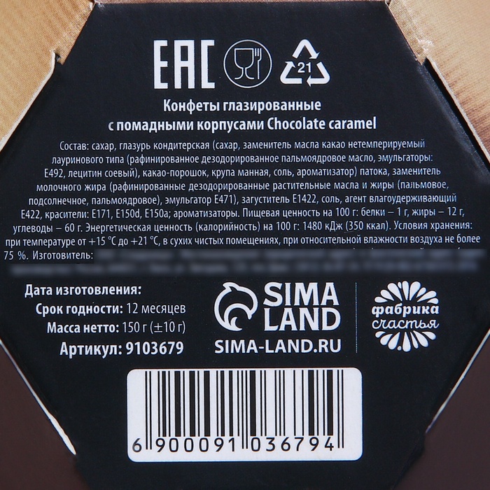 Состав: сахар, глазурь кондитерская (сахар, заменитель масла какао нетемперируемый лауринового типа (рафинированное дезодорированное пальмоядровое масло, эмульгаторы: Е492, лецитин соевый), какао-порошок, крупа манная, соль, ароматизатор) патока, заменитель молочного жира (рафинированные дезодорированные растительные масла и жиры (пальмовое, подсолнечное, пальмоядровое), эмульгатор Е471), загуститель Е1422, соль, агент влагоудерживающий Е422, красители: Е171, Е150d, Е150а; ароматизаторы.