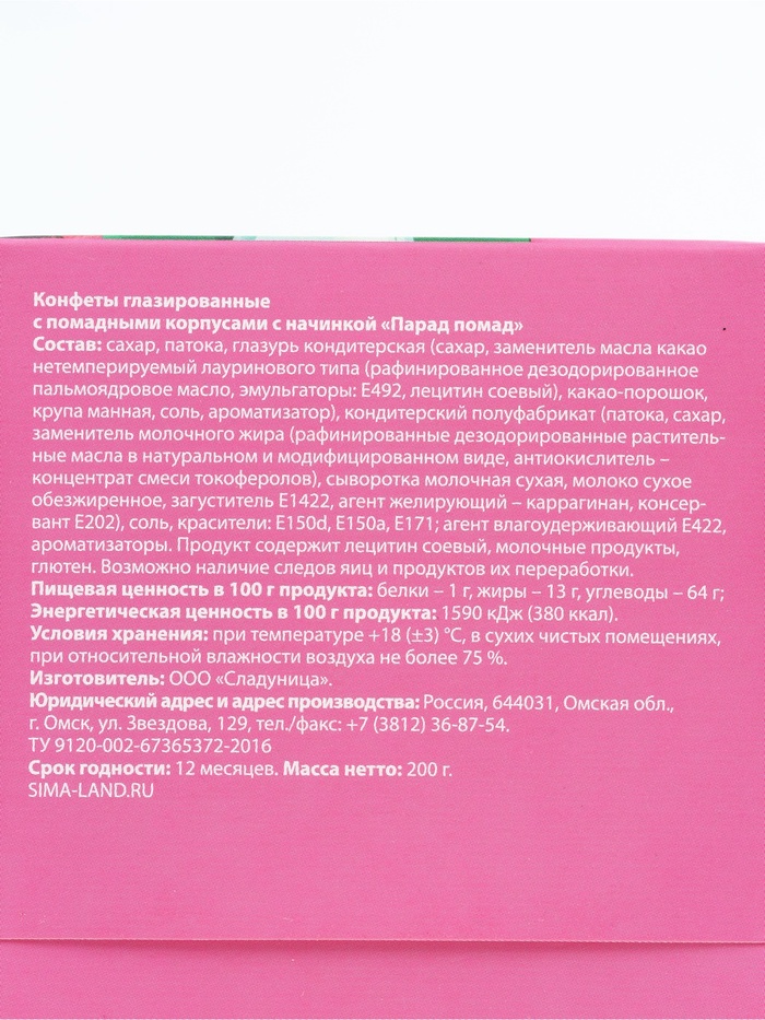 Сахар, патока, глазурь кондитерская (сахар, заменитель масла какао (рафинированное дезодорированное пальмоядровое масло, эмульгаторы: Е492, лецитин соевый), молоко сухое обезжиренное, какао-порошок, какао тертое, кокосовое масло, соль, ароматизатор "Ванилин"); молоко цельное сгущенное с сахаром (нормализованное молоко, сахар (сахароза, лактоза)); инвертный сироп (сахар, регуляторы кислотности: Е500(ii), Е330); заменитель молочного жира (рафинированные дезодорированные растительные масла и жиры (пальмовое, подсолнечное, пальмоядровое), эмульгатор Е471); жир специального назначения (масло ши, пальмовое масло, рапсовое масло, соевое масло), молоко сухое обезжиренное, какао-порошок, соль, ароматизатор «Тоффи». Может содержать следы глютена, яиц и продукты их переработки.