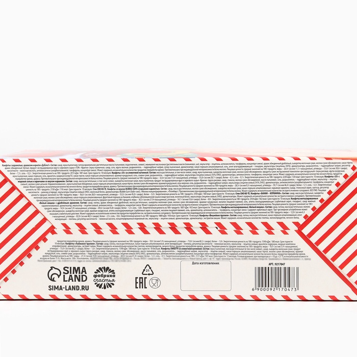 Состав: сахар, патока, арахис обжаренный дроблёный, масла растительные, сыворотка молочная сухая, молоко сухое обезжиренное, крахмал кукурузный, желатин пищевой говяжий, соль, агенты влагоудерживающие (сорбитовый сироп, глицерин), сахар жжёный карамелизованный, ароматизатор, эмульгатор – лецитин соевый, антиокислитель – токоферолы, концентрат смеси.