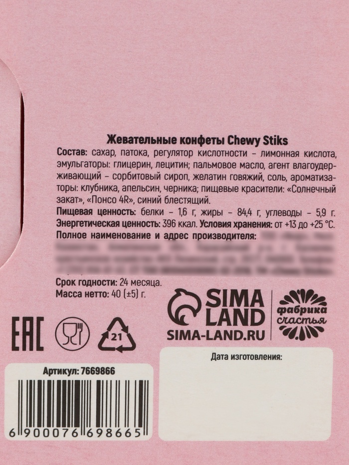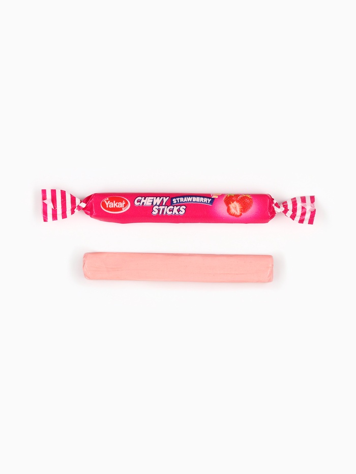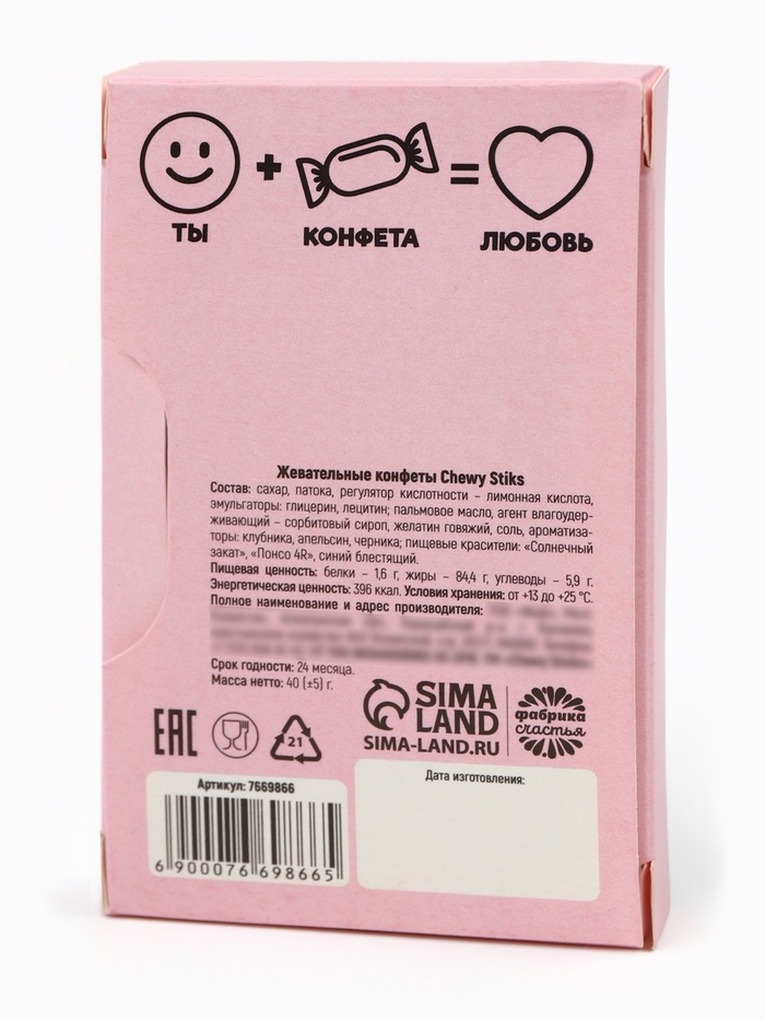 Состав: сахар, сироп глюкозный, масло растительное (пальмовое), регулятор кислотности (лимонная кислота), желатин говяжий, концентрат сока клубники (0,3 %), концентрат сока вишни (0,4 %), концентрат соков апельсина и лимона (0,2 %), эмульгаторы (Е471, лецитин подсолнечный), ароматизатор искусственный, идентичный натуральному, краситель (красный свекольный, Е160а).