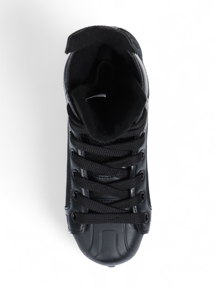 - Основа ботинка: пластик. Жёсткий материал создаёт надёжную защиту от попадания шайбы. Пластиковый носок обеспечивает стойкость изделия к порезам и истиранию.