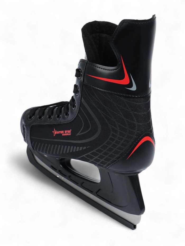 • Основа ботинка: пластик. Жёсткий материал создаёт надёжную защиту от попадания шайбы. Пластиковый носок обеспечивает стойкость изделия к порезам и истиранию.