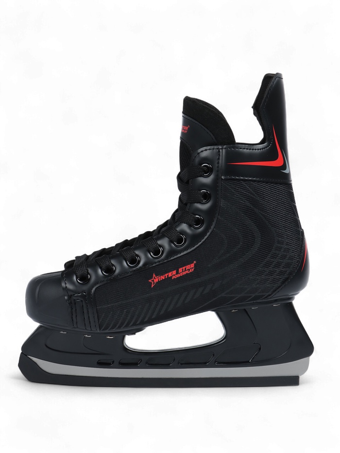 - Основа ботинка: пластик. Жёсткий материал создаёт надёжную защиту от попадания шайбы. Пластиковый носок обеспечивает стойкость изделия к порезам и истиранию.