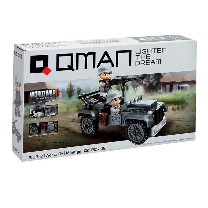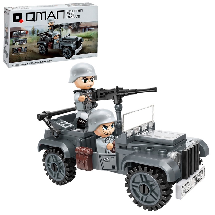 - 82 детали для сборки: В комплекте элементы корпуса, колёса, рулевое управление и 2 фигурки военных.