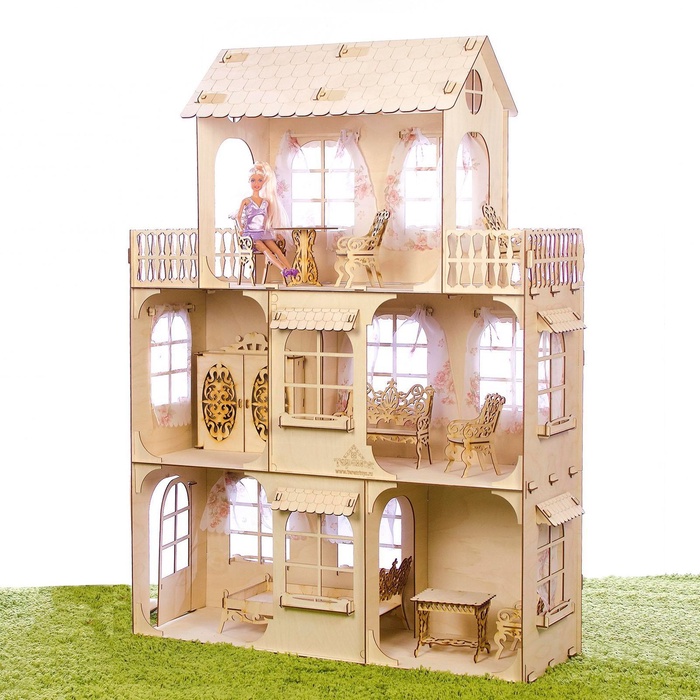 Соберите из деревянного конструктора большой кукольный дом для любимых игрушек! Трёхэтажный дом выглядит очень роскошно: в доме 5 уютных больших комнат и 2 террасы, на каждом окне есть карниз и гардина для штор. С балконов 3 этажа кукольные жители смогут любоваться окрестностями.