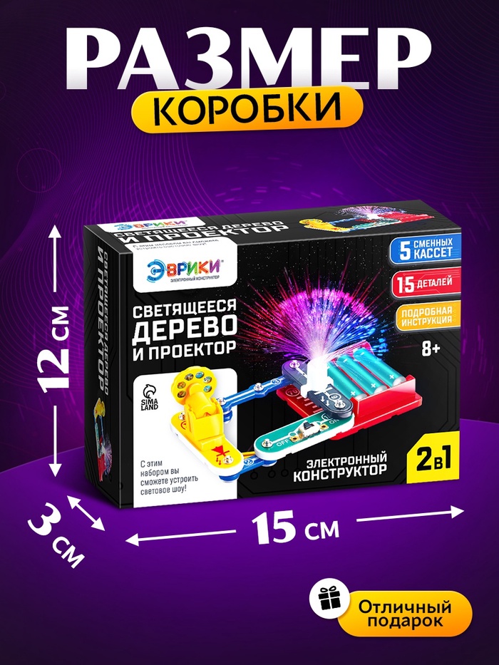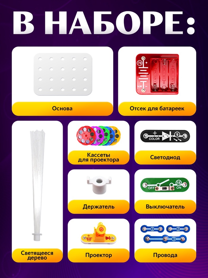 Ребёнок интересуется научными экспериментами? Предложите ему собрать проектор и светящееся дерево, а потом устроить световое шоу в домашних условиях! Конструктор познакомит юного исследователя с основами физики и электроники.
