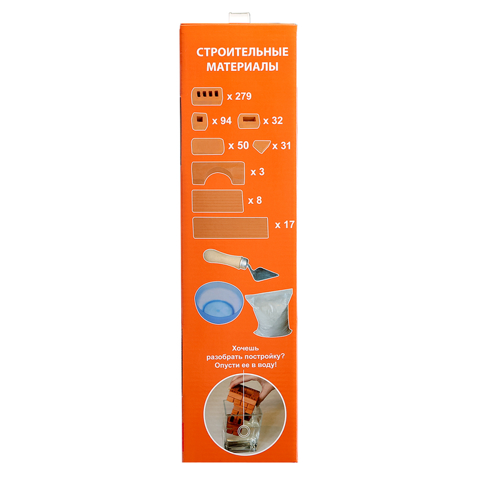Специальный мастерок, входящий в комплект, поможет удобно нанести цемент на детали. Он точно такой, как у взрослых строителей, только меньшего размера.