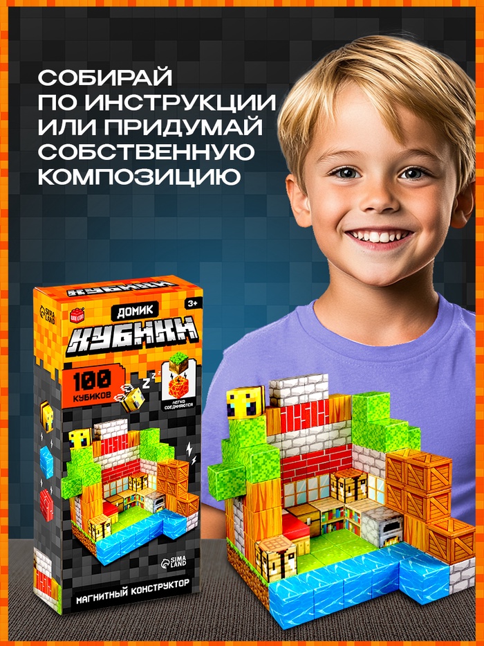 - Стиль кубических миров: конструктор развивает креативность в знакомом визуальном формате. Дети с лёгкостью переносят игровой опыт в реальность, создавая и улучшая свои постройки.