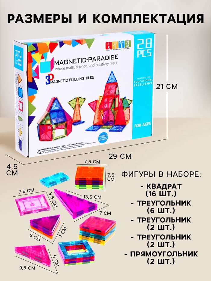 - Квадрат (16 шт.) — 7.5 × 7.5 см.